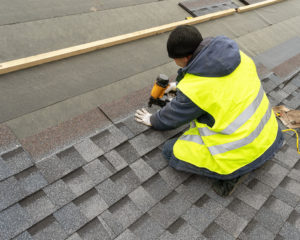 Qualified workman in uniform work wear using air or pneumatic nail gun and installing asphalt or bitumen shingle on top of the new roof under construction residential building